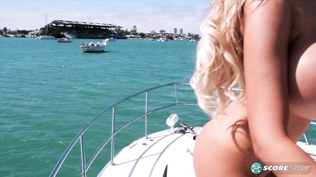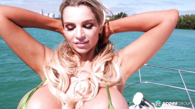 Description: Sexy stunner Katy Ann is a dancin' machine on the good ship SCORELAND as it cruises the waters, the skyline of Magic City Miami in the background. The weather cooperates and the sun isn't blocked by cloud cover as if it knows Katy Ann is here from Texas. Regular boaters in the area see a lot of bouncing swimsuit babes in their travels, but have they ever seen anyone as stacked and shapely as Katy Ann? She does justice to cut-off denim shorts.
